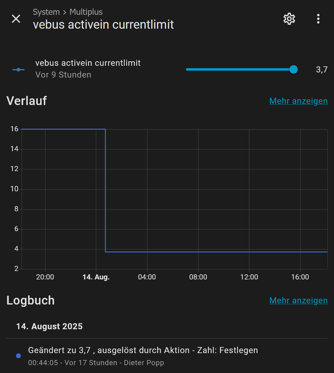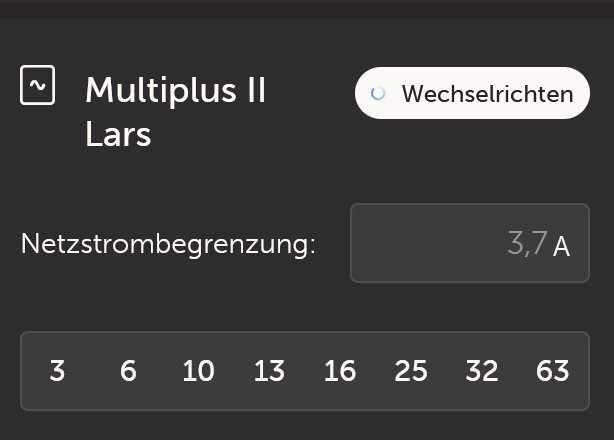in der Victron Integration vom HA findet man einen Schieberegler, um den maximal zulässigen Landstrom zu begrenzen.